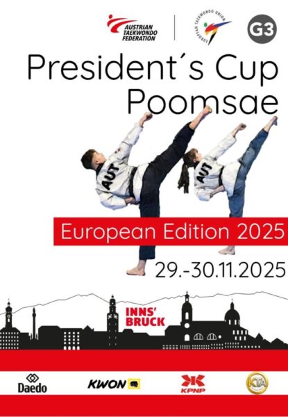 23. November 2025Am 29. und 30. November fand in der Olympiaworld Innsbruck der prestigeträchtige President Cup G3 in der Disziplin Formen statt, ausgetragen vom Österreichischen Taekwondo Verband. Dieses hochkarätige Weltranglistenturnier war mit der internationalen Elite der Formenläufer – unter anderem aus den USA, China und Kolumbien u.v.w.– außerordentlich stark besetzt.